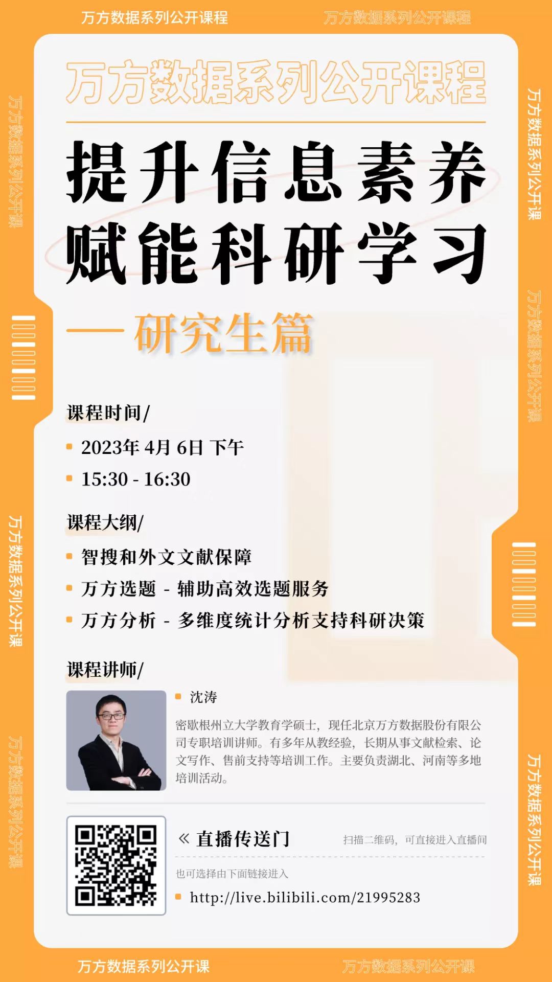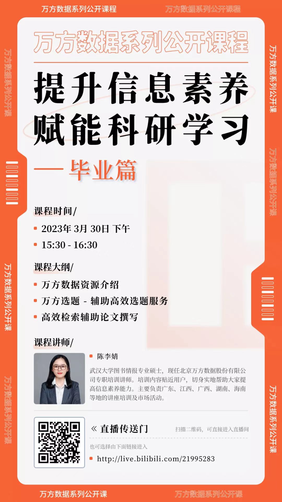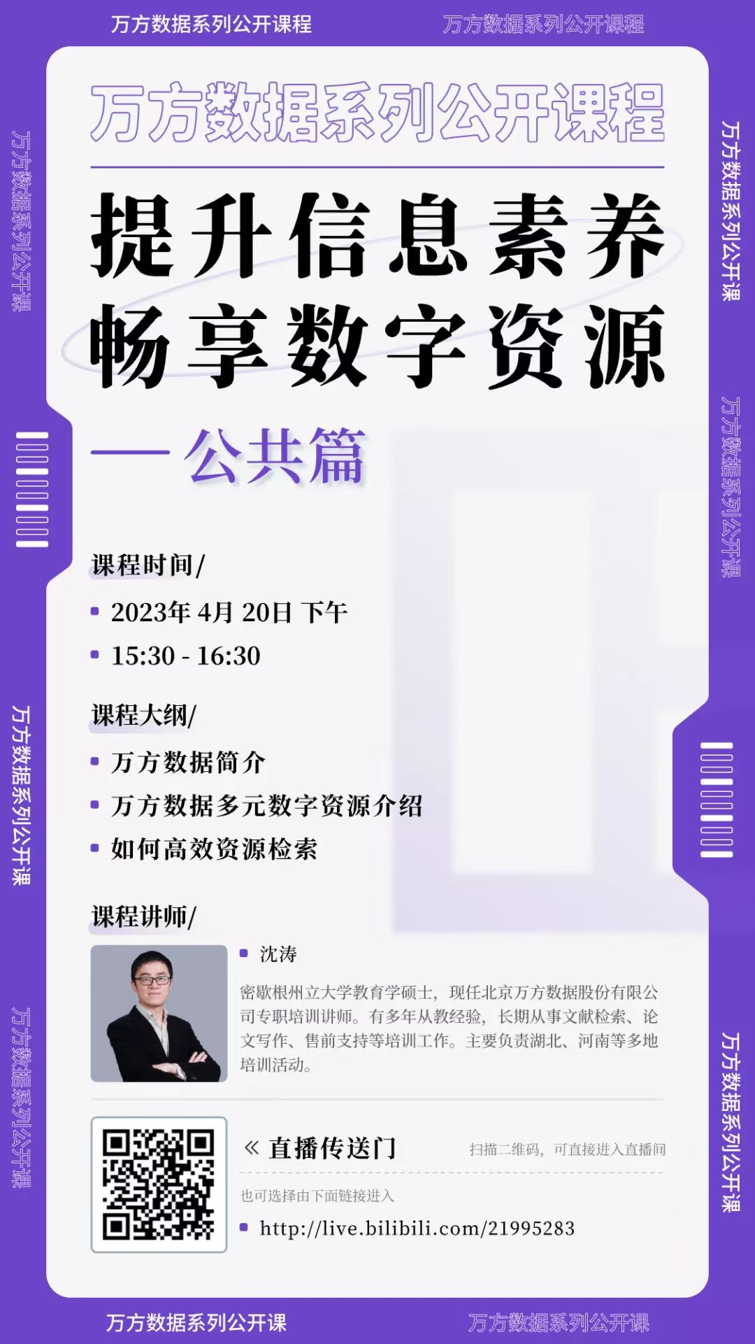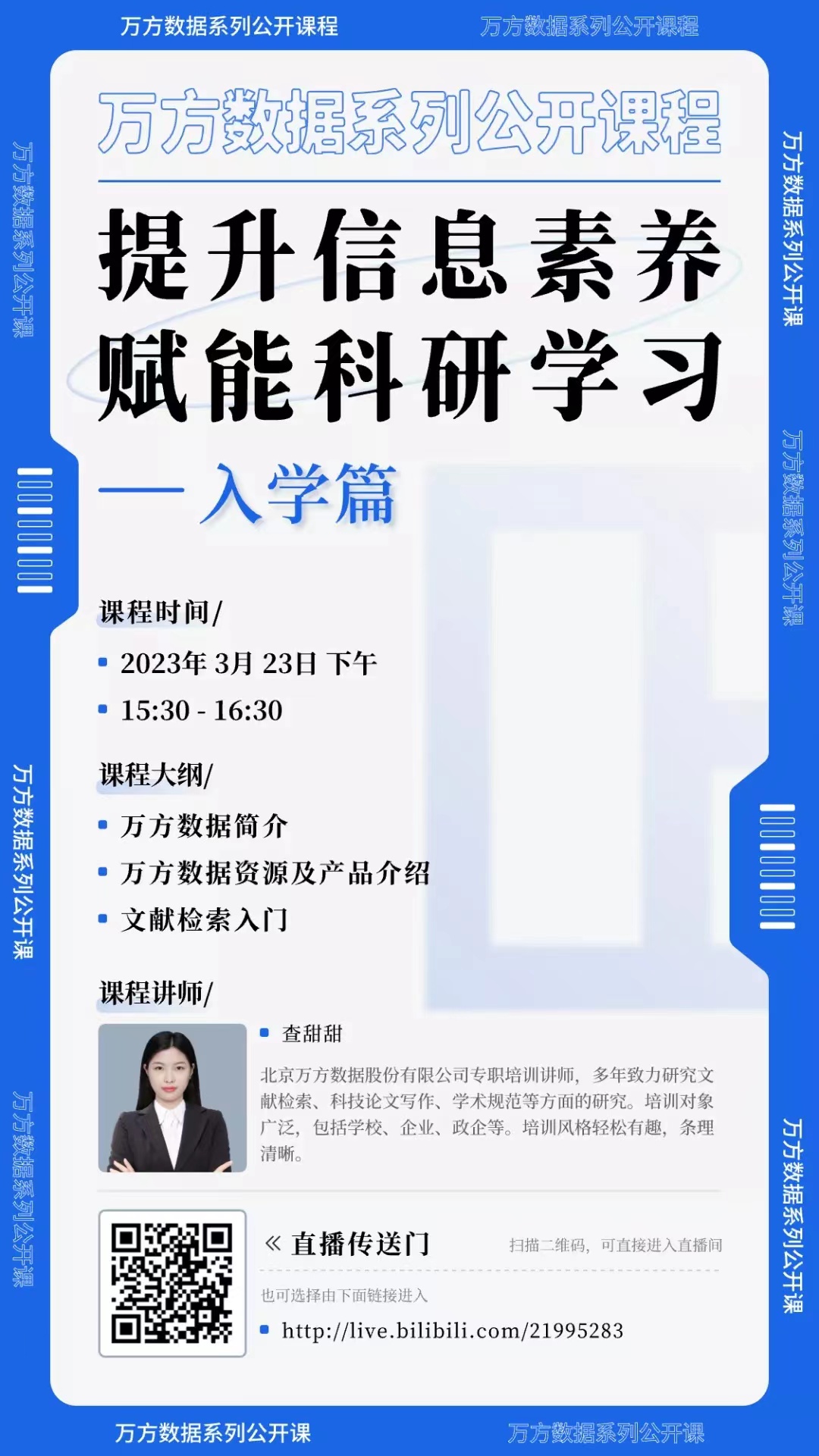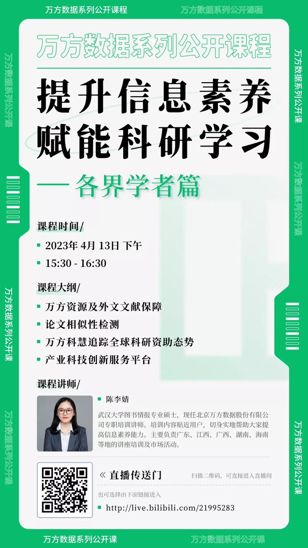 凛冬散尽,暖风和煦,伴随着春天的脚步,万方数据特别推出“提升信息素养,赋能科研学习”系列线上直播讲座,将从平台简介、资源介绍、终端应用等多个维度,帮助大家更好的利用万方数据知识服务平台的资源,提升用户在精准发现、获取与分析、沉淀学术信息等方面的能力,助力科研论文、学术论文的撰写,促进科技创新、拓展发现新领域。