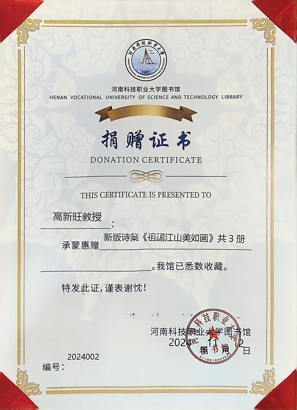 2024年11月12日上午,河南省作家协会会员高新旺老师,向我馆捐赠个人新作——诗词歌赋散文集《祖国江山美如画》3册,《男儿当自强》1册。图书馆周吉生馆长接受了图书捐赠。