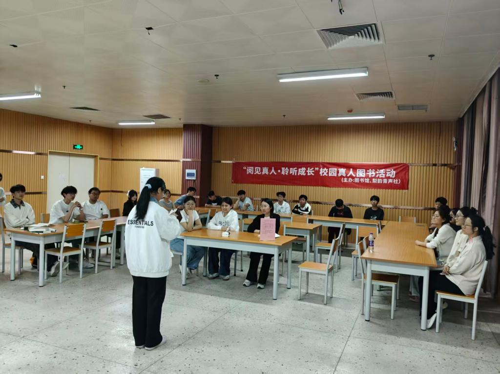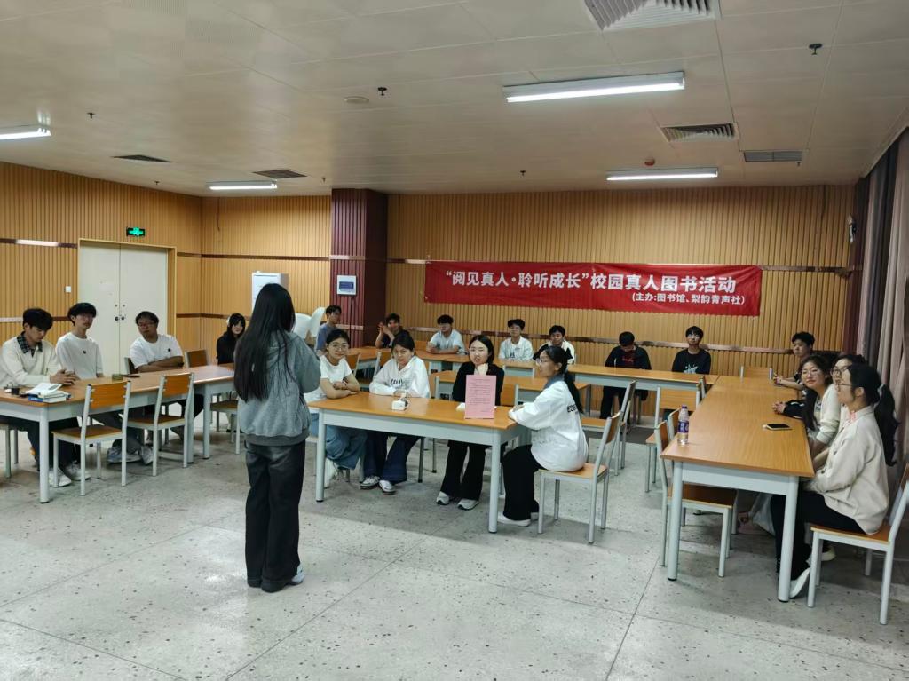 图书馆为传递阅读力量、培育浓厚校园书香氛围,引导师生养成良好阅读习惯,搭建思想碰撞与知识交流的优质平台,深化校园文化建设、落实全民阅读相关要求,2026年4月17日晚19:00,与梨韵青声社联合主办的“阅见真人·聆听成长”真人图书活动第二期,在图书馆507活动室顺利落幕。来自不同学院的20余名读者齐聚一堂,以书为媒、以分享为桥,在真诚交流中感悟书籍魅力,在静心聆听中汲取成长力量,共同书写校园书香篇章。